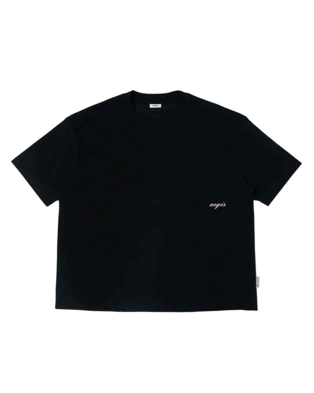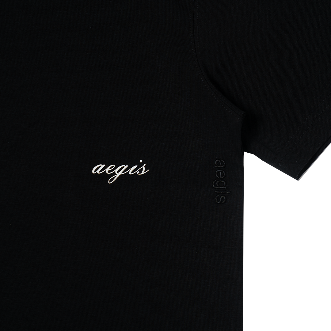 A cropped tee with a structured boxy fit, made from Sorona® fabric for softness, stretch, and breathability. Finished with a rolled hem (gulung) for a subtle twist, "aegis" script embroidery, and a clean crew neck
